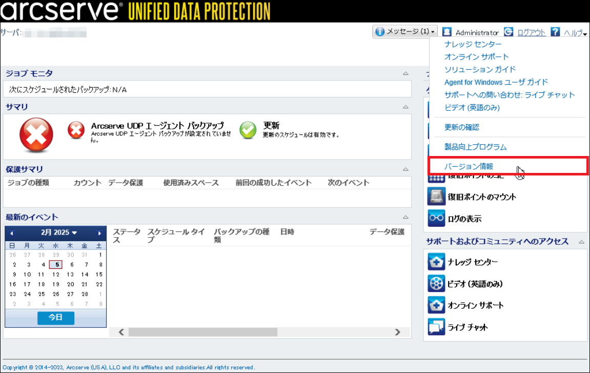 3.Arcserve UDP にログインし、[ヘルプ]—[バージョン情報]をクリックします。