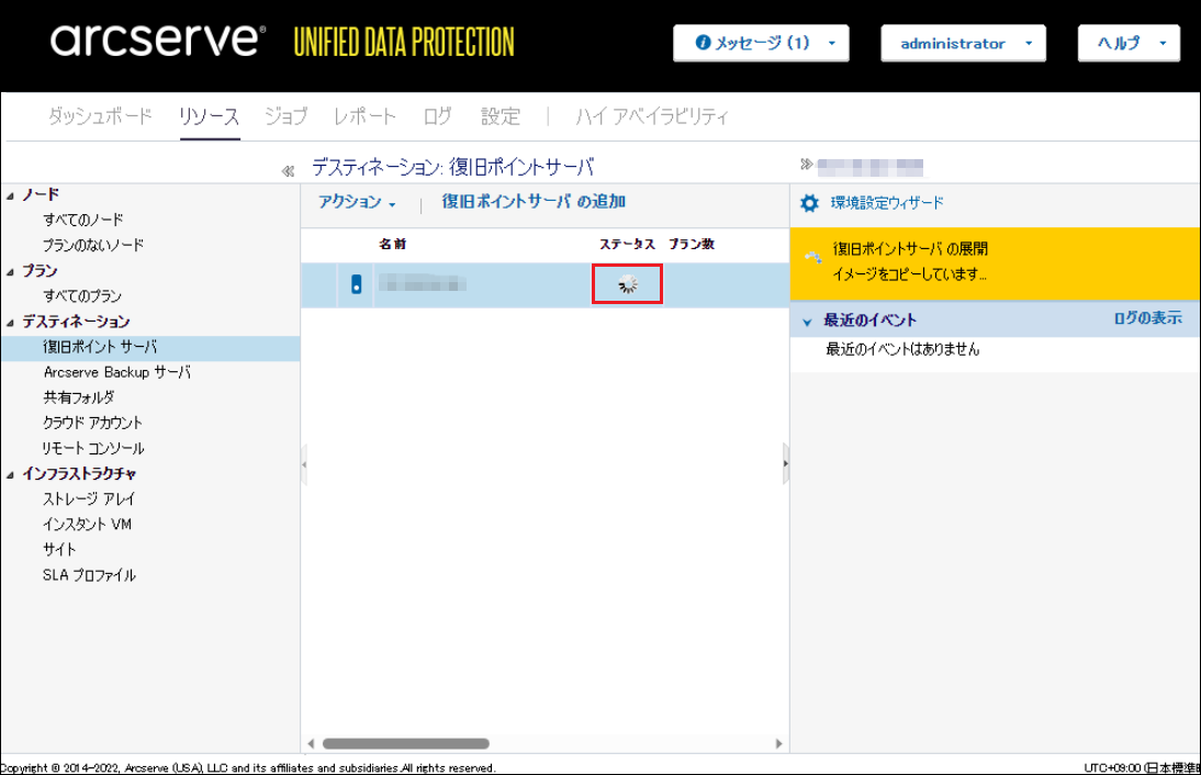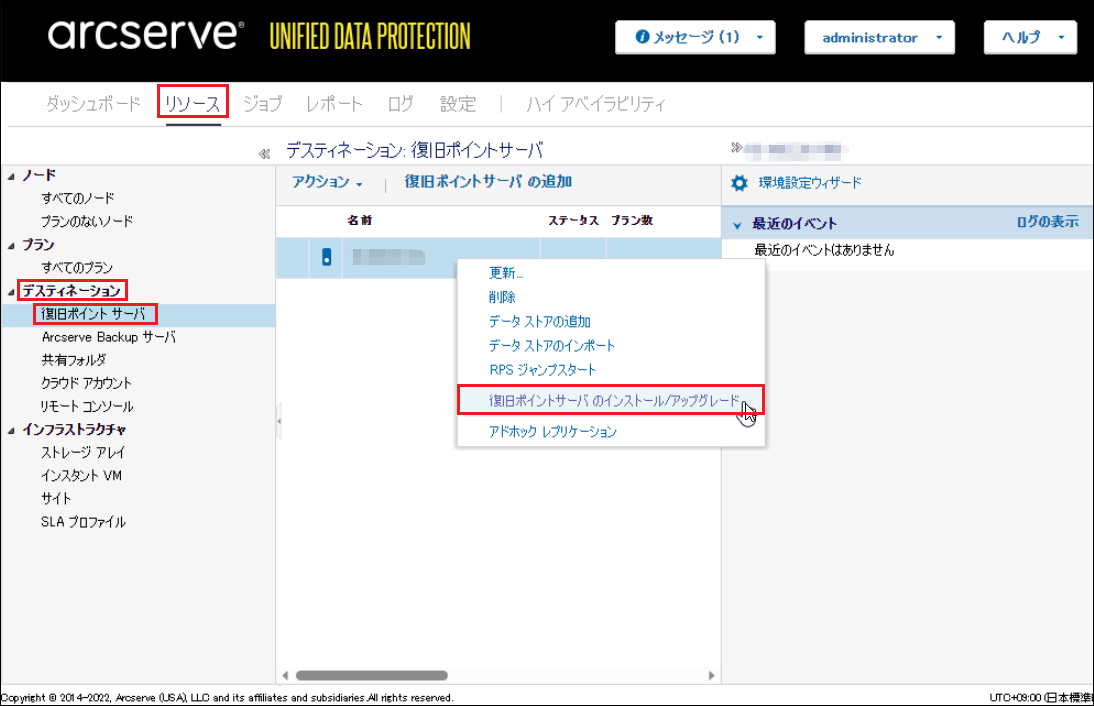 2.「Arcserve UDP コンソール」画面が開いたら、[リソース]—[デスティネーション]—[復旧ポイントサーバ]をクリックし、アップグレードする復旧ポイントサーバーを選択します。