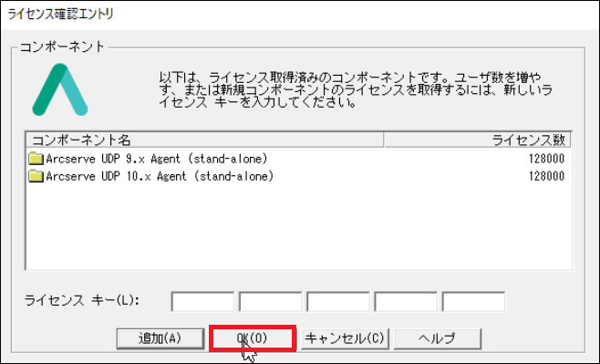 4.入力した[コンポーネント名](製品名)と、[ライセンス数]が追加されたことを確認し、[OK]をクリックし画面を閉じます。