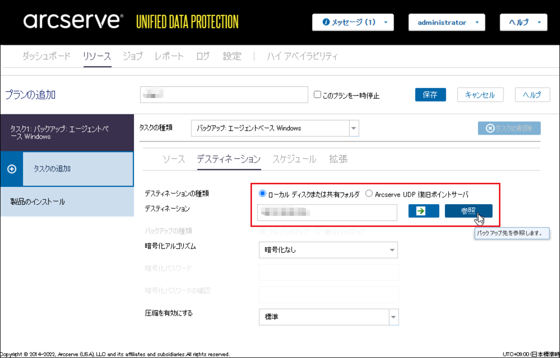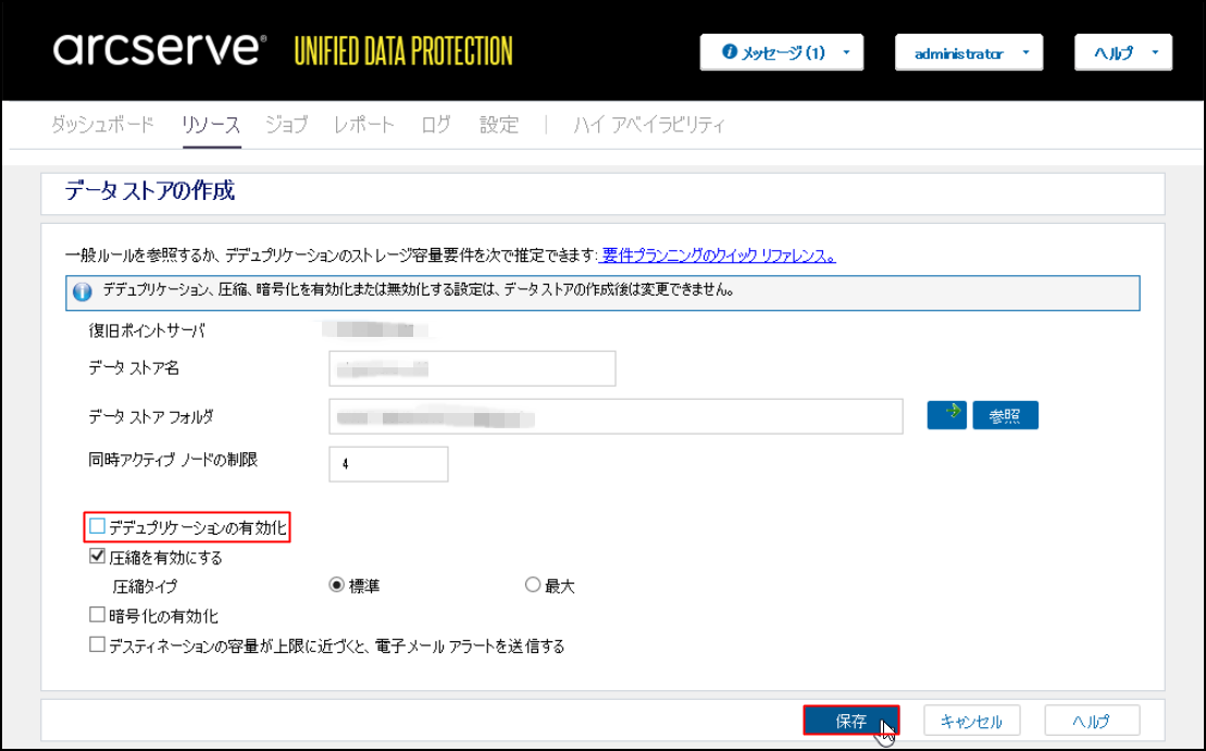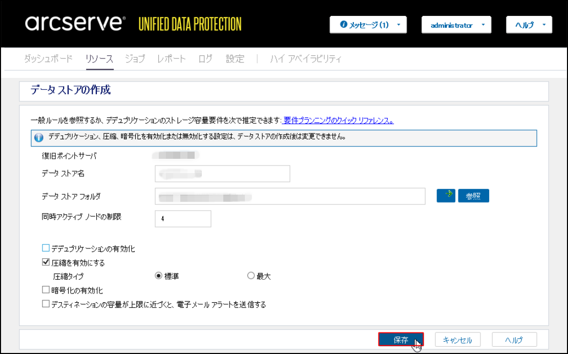 ([圧縮を有効にする]、[暗号化の有効化]、[デスティネーションの容量が上限に近づくと、電子メールアラートを送信する]は必要に応じて設定してください。)