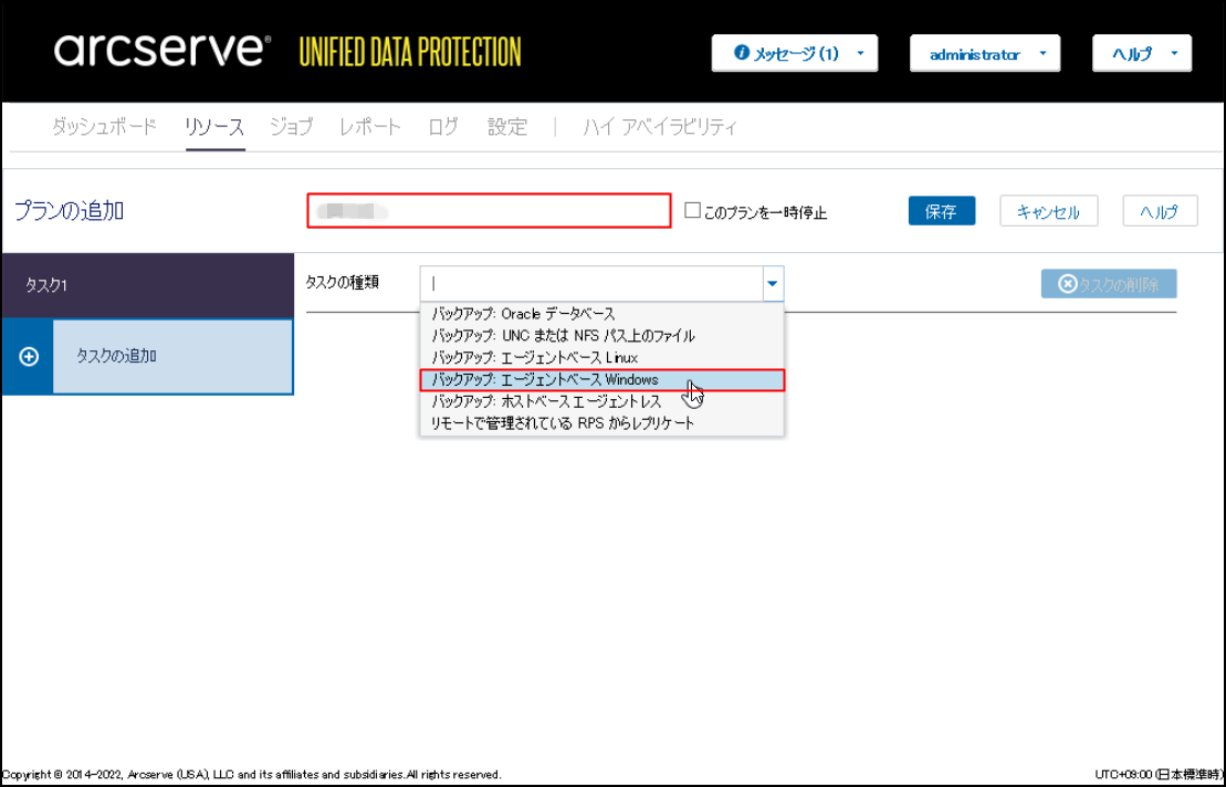 2.任意のプラン名を入力します。「タスクの種類」は[バックアップ:エージェントベース Windows]を選択します。