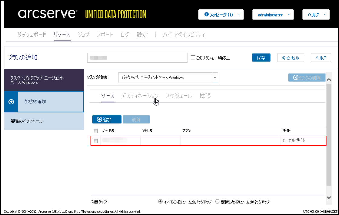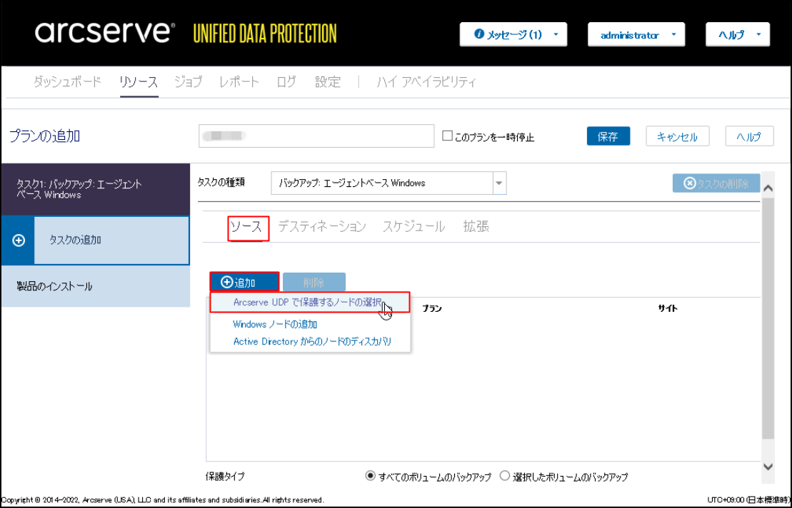 3.ソースタブにおいて[+追加]をクリックし、[Arcserve UDPで保護するノードの選択]を選択します。