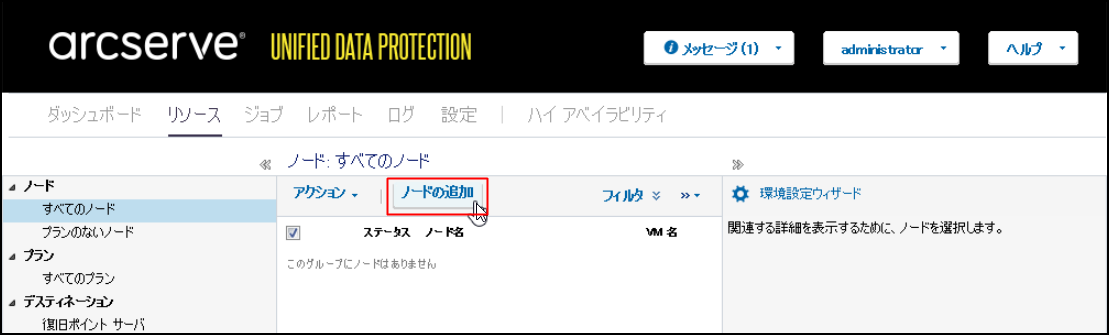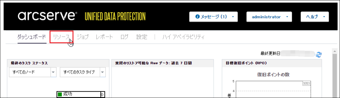 1.バックアップ対象のWindows Serverのノード追加を行うため、画面上部の[リソース]をクリックします。