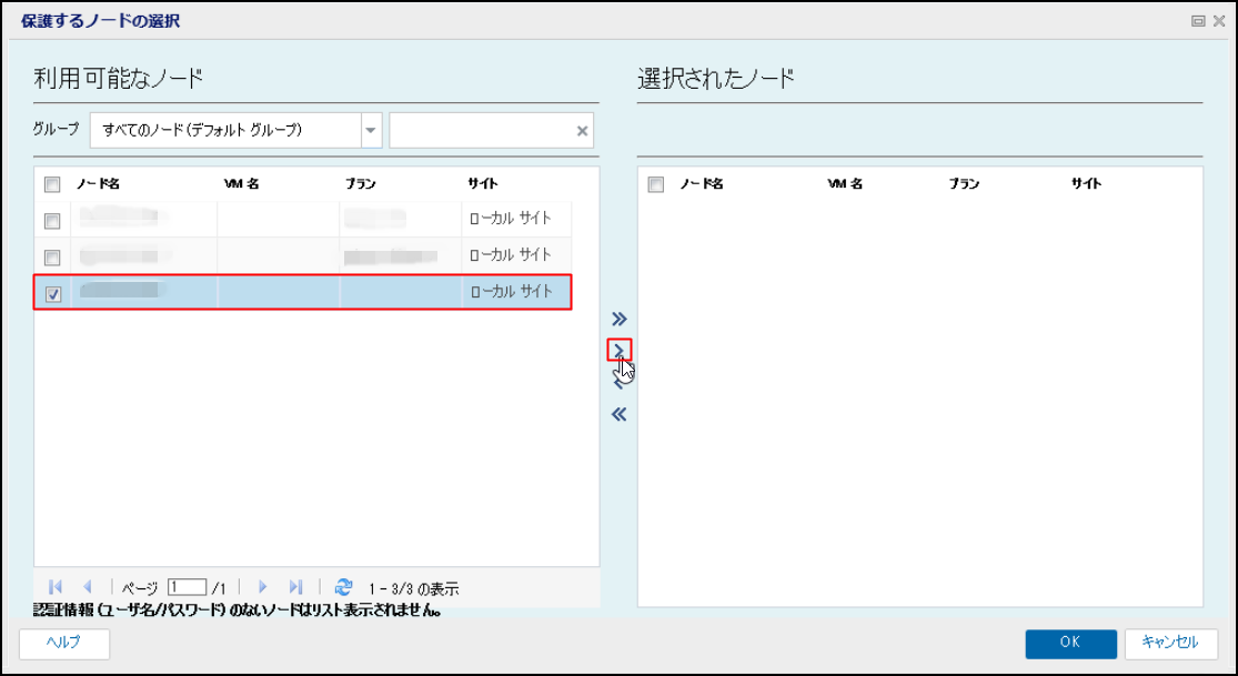 4.保護対象となるノードを選択し、[>]をクリックします。右側「選択されたノード」に移行したことを確認したら、[OK]をクリックします。