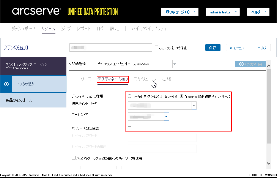 「デスティネーションの種類」を[Arcserve UDP復旧ポイントサーバ]とし、「復旧ポイントサーバ」、「データストア」を設定します。