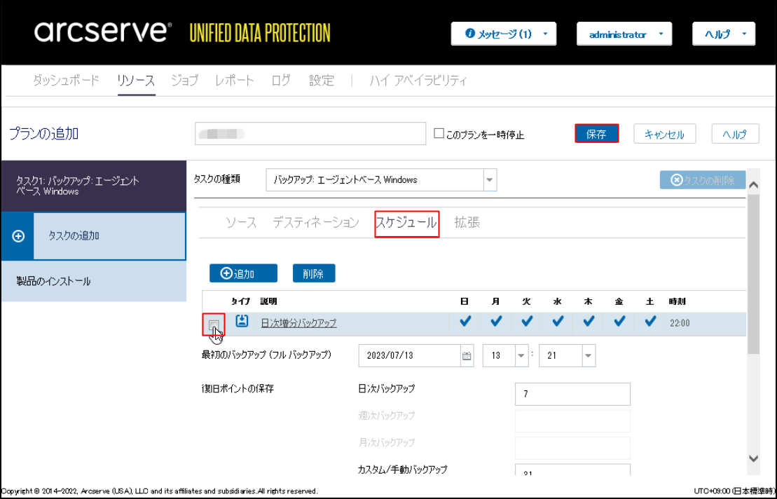 「バックアップスケジュールの編集」画面で、スケジュールの設定を行います。完了後、[保存]をクリックします。