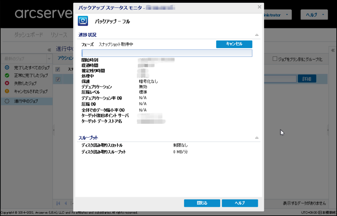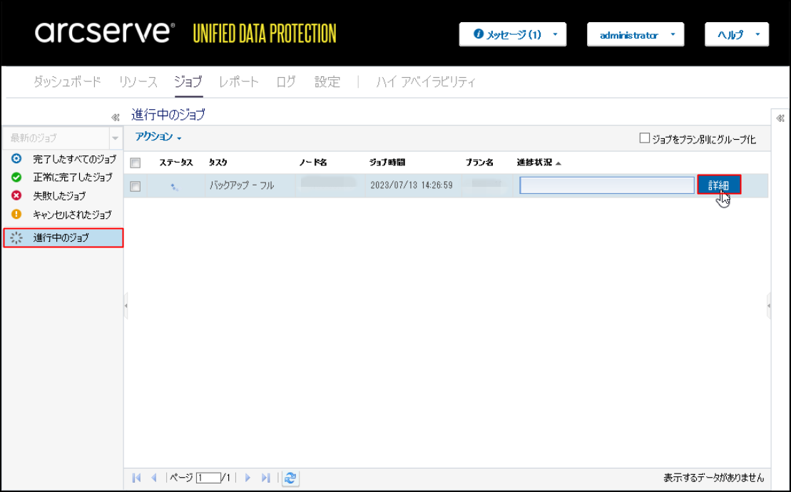 4.バックアップが進みます。画面上部の[ジョブ]をクリックした後、[進行中のジョブ]で確認できます。[詳細]をクリックすると、「バックアップステータスモニタ」を表示できます。
