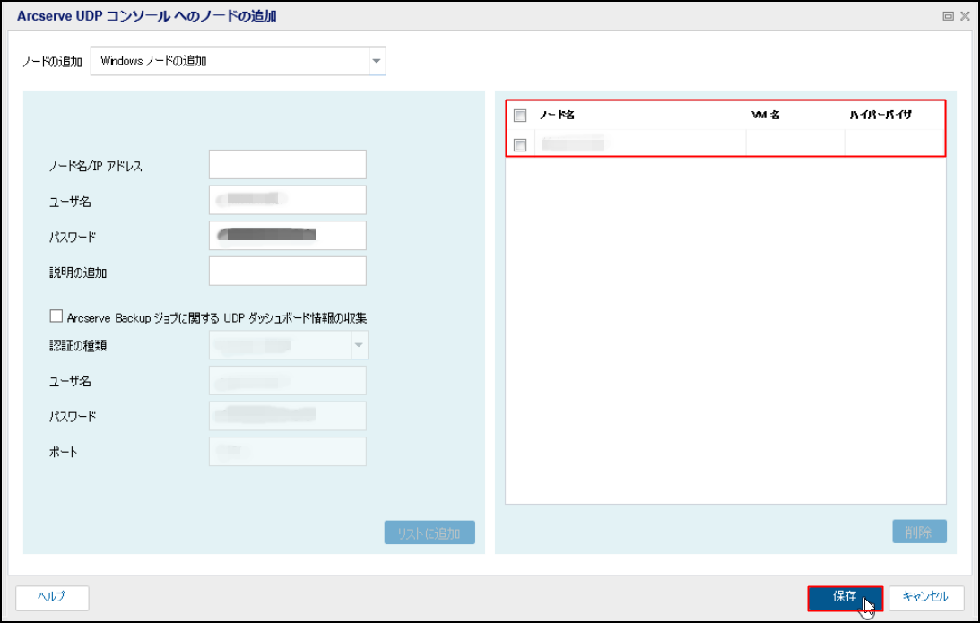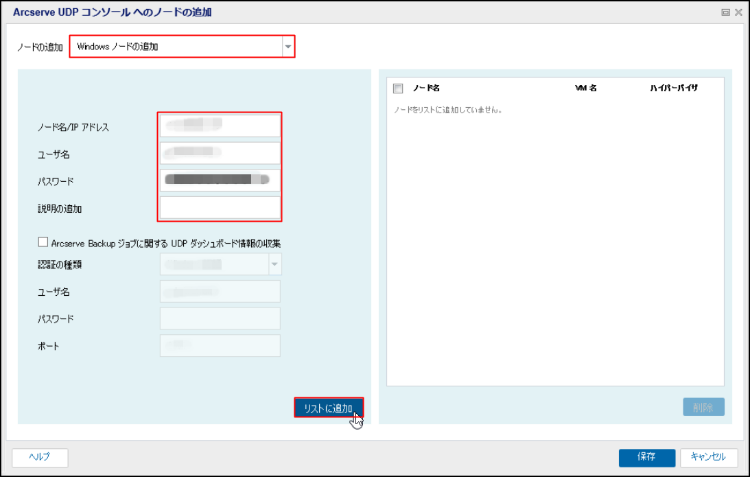 3.[Windowsノードの追加]をクリックし、「ノード名/IPアドレス」、「ユーザ名」、「パスワード」、「説明」(任意)を入力し、[リストに追加]をクリックします。