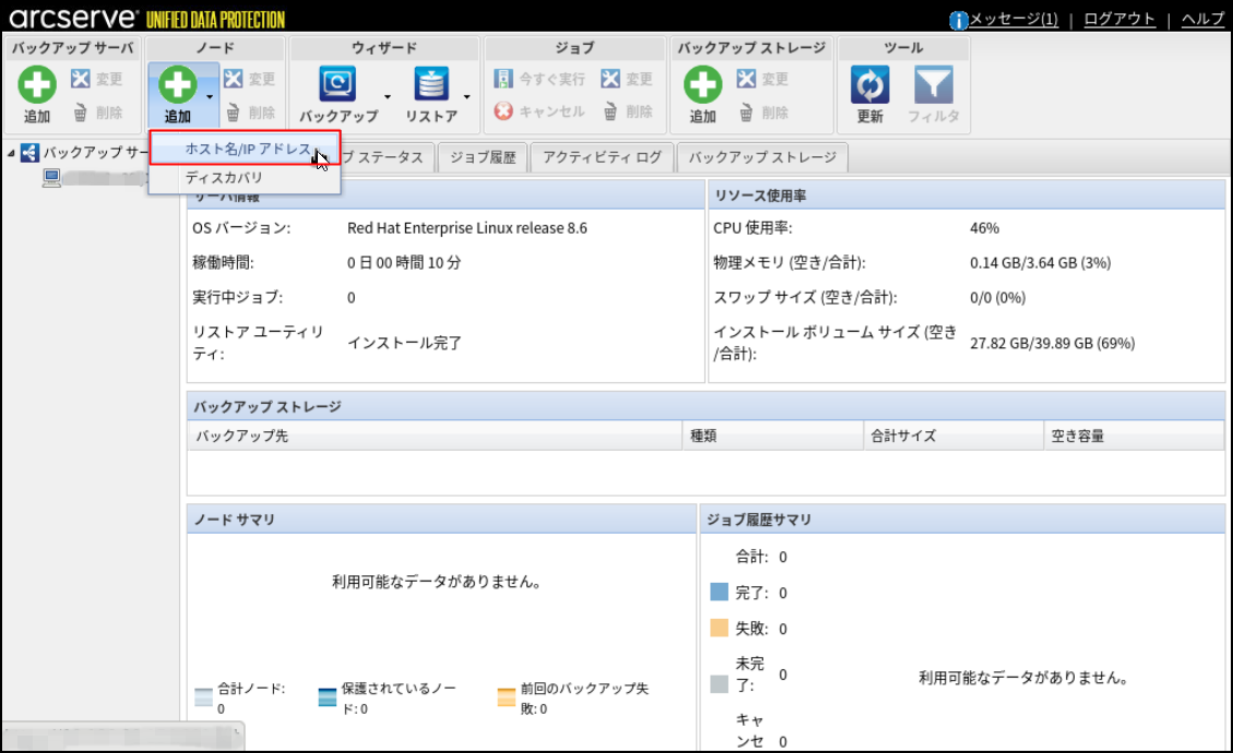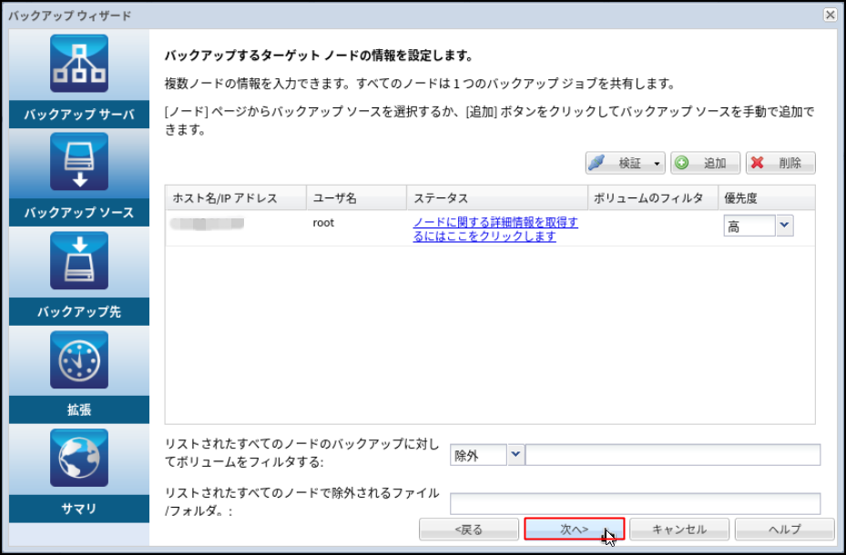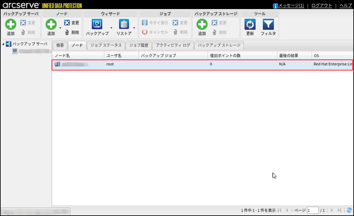 6.検証が終了すると元の画面に戻ります。[ノード]タブに、バックアップ対象のLinuxサーバーのIPアドレスが追加されたことを確認します。
