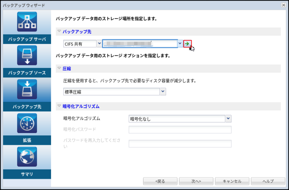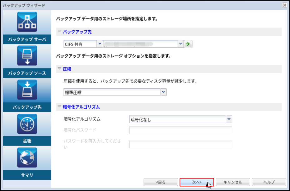 11.バックアップ保存先ストレージを選択します。本事例ではサーバーインスタンス(Windows)上の共有フォルダーに保存するため、[CIFS共有]を選択し、IPアドレス、フォルダー名をフルパスで入力します。