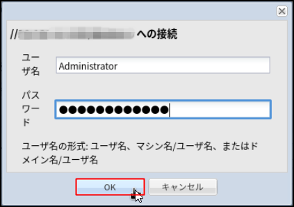 12.バックアップ保存先ストレージとなるサーバーインスタンスの接続許可を求められるので、「ユーザ名」、「パスワード」を入力し[OK]をクリックします。