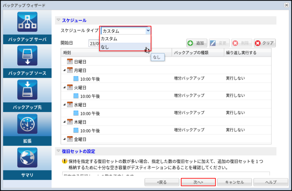 この事例では手動でバックアップを取得するため、「スケジュールタイプ」を[なし]としています。