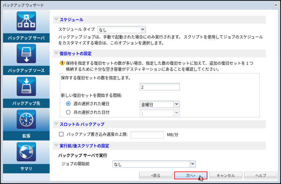 15.必要に応じてバックアップの保存設定を行い、[次へ]をクリックします。