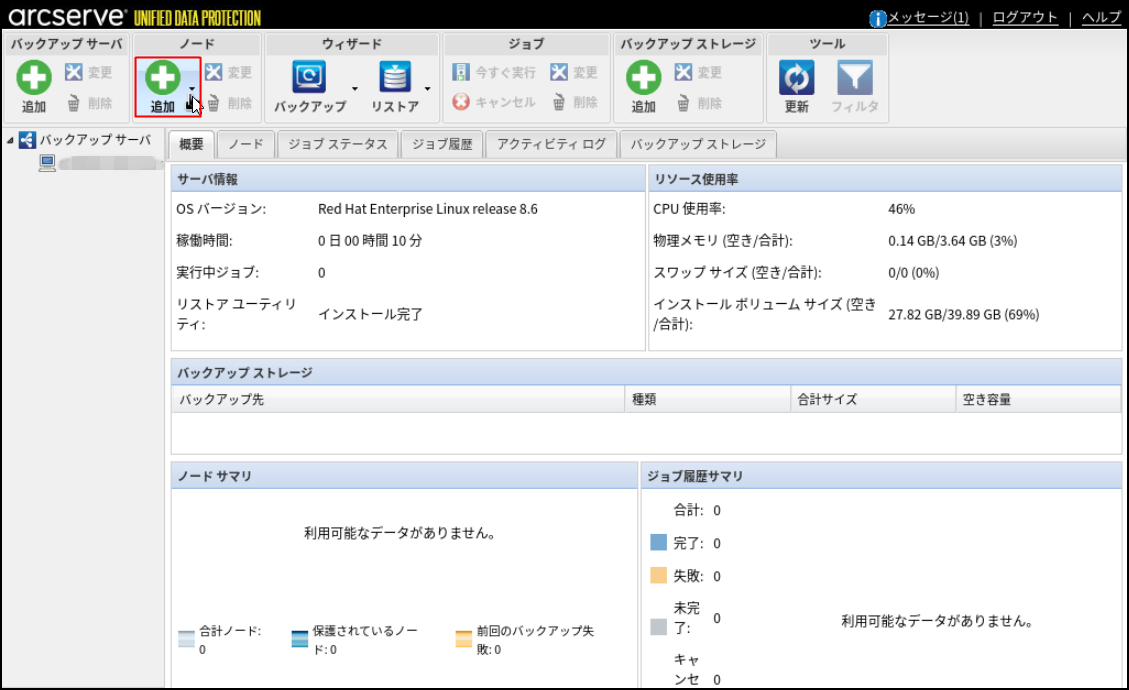 バックアップ対象となるLinuxサーバーを追加するため、[ノード]—[追加]をクリックします。