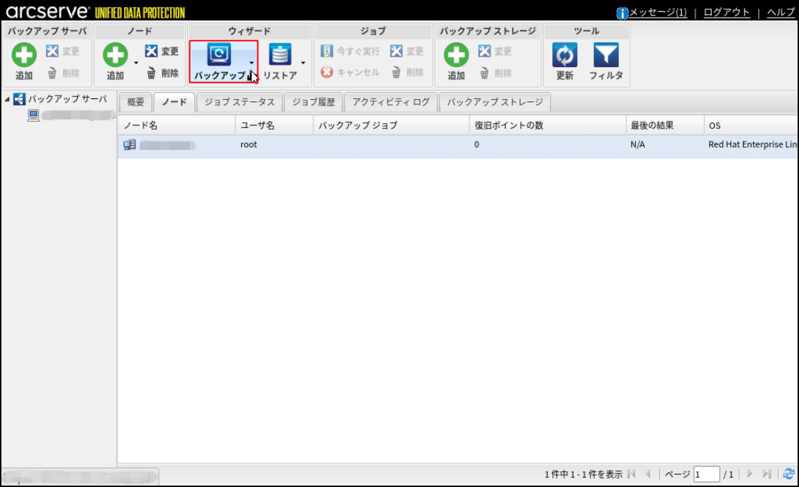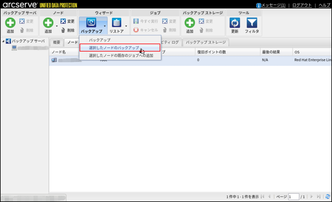 7.[ノード]タブにて、バックアップ対象のLinuxサーバーのノード名をクリックし、[バックアップ]をクリックします。