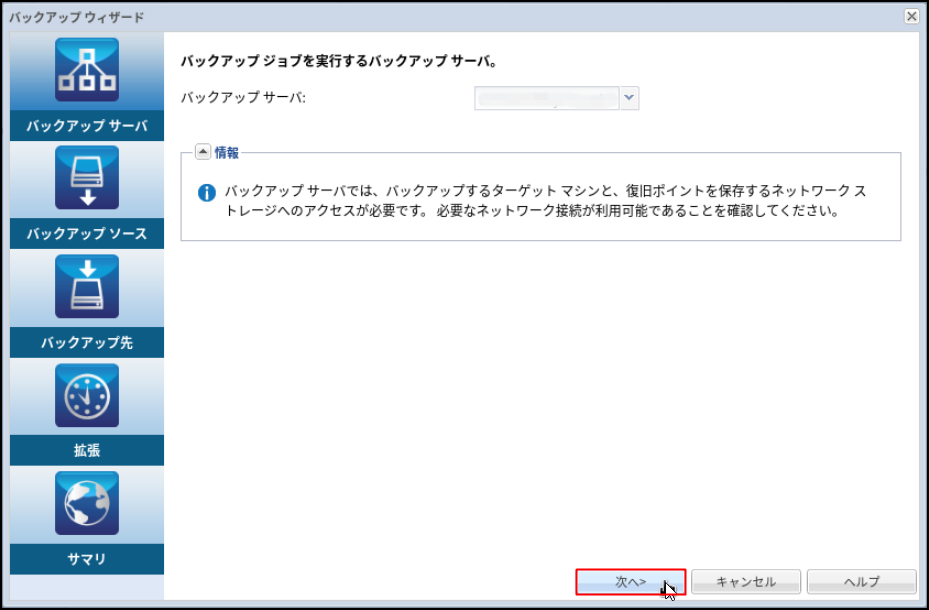 10.バックアップ対象のサーバーが選択されていることを確認して、[次へ]をクリックします。
