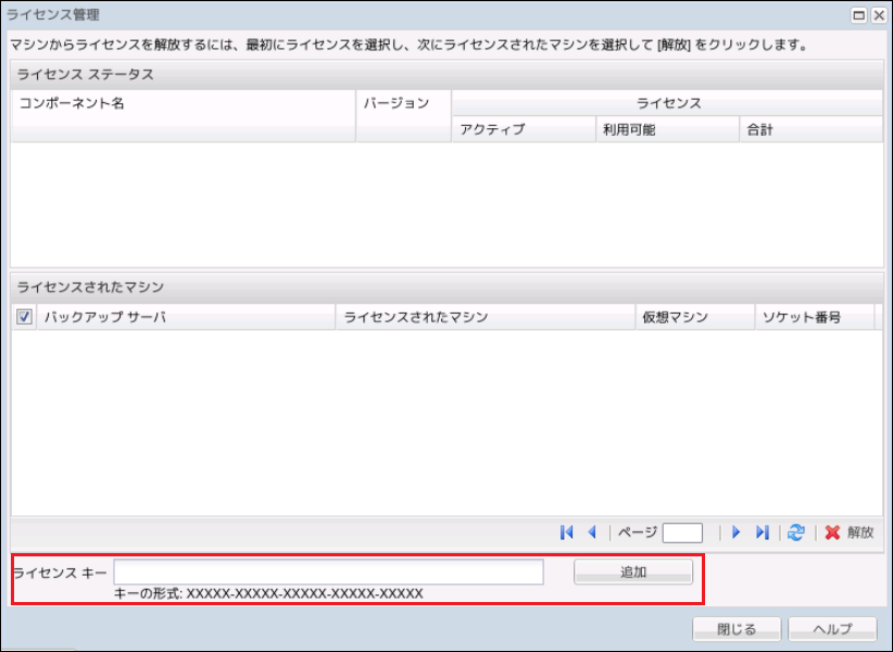 3.[ライセンス管理]ダイアログボックスが表示されますので、「ライセンスキー」の項目に25桁のライセンスキーを入力します。