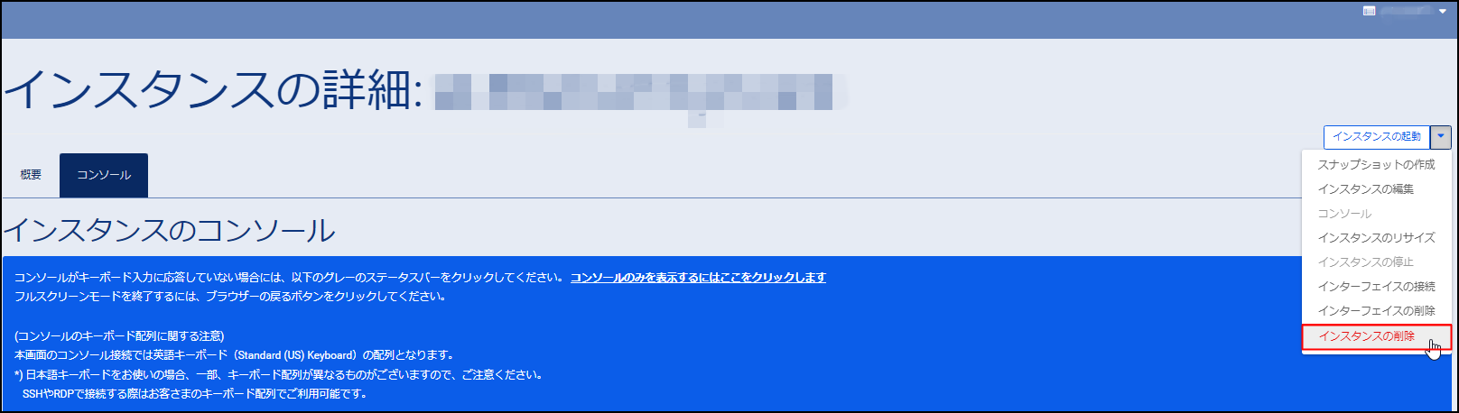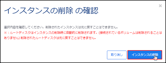 ※ここでインスタンスの削除を行わない場合は、ボリュームメニューから、ボリュームを切断してください。