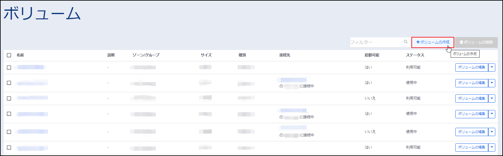 [サーバーインスタンス]—[ボリューム]—[ボリュームの作成]をクリックします。