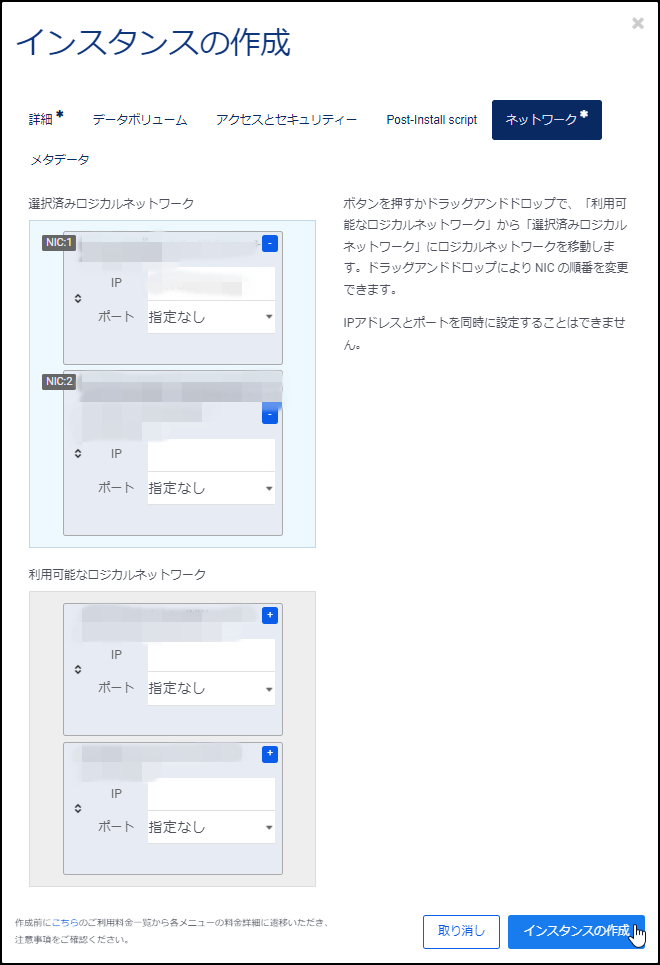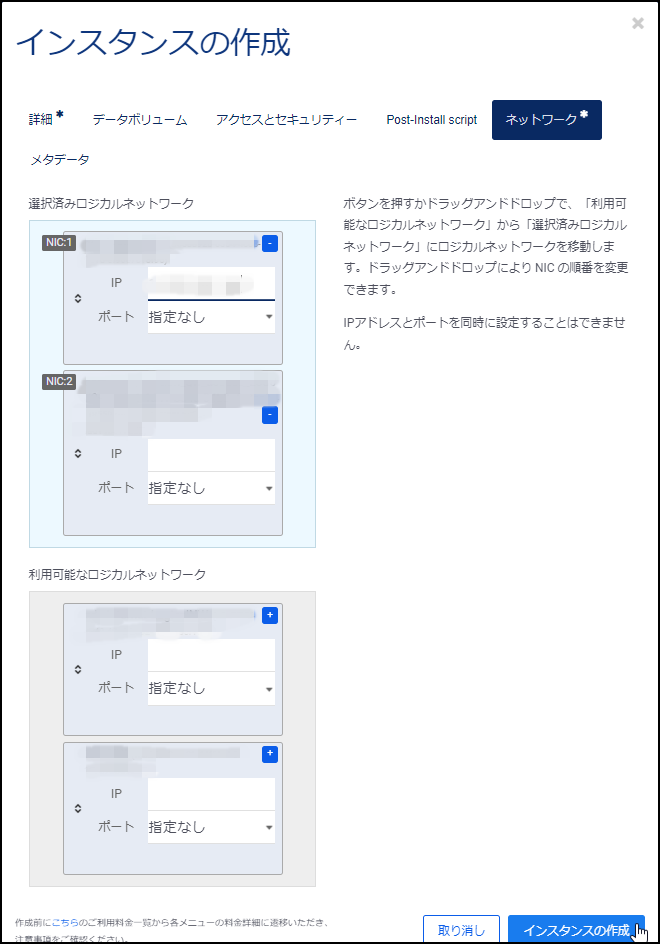 5.利用可能なロジカルネットワークからこのインスタンスに設定するIPアドレスを選択し、選択済みロジカルネットワークにIPアドレスを設定します。