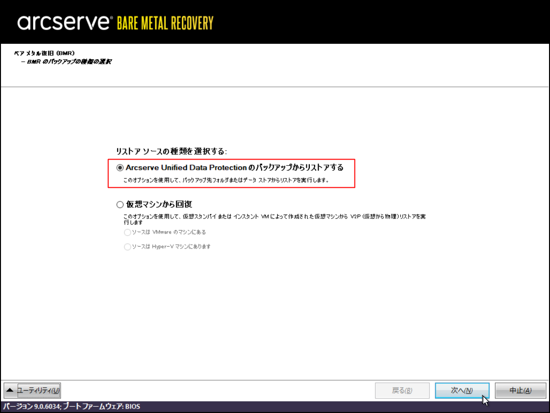 4.「リストアソースの種類を選択する」画面にて、[Arcserve Unified Data Protection のバックアップからリストアする]が選択されていることを確認し、[次へ]をクリックします。