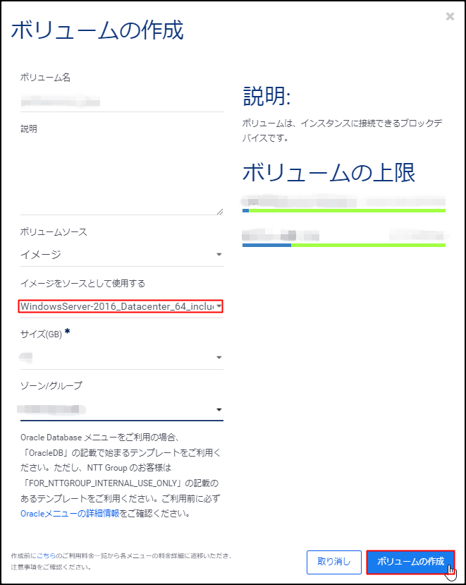 3.以下を入力/選択し、[ボリュームの作成]をクリックします。