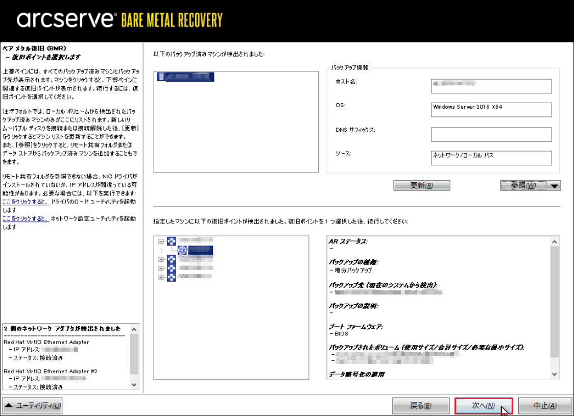 15.下記のような画面にバックアップファイル情報が表示されます。[次へ]をクリックします。