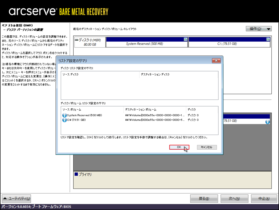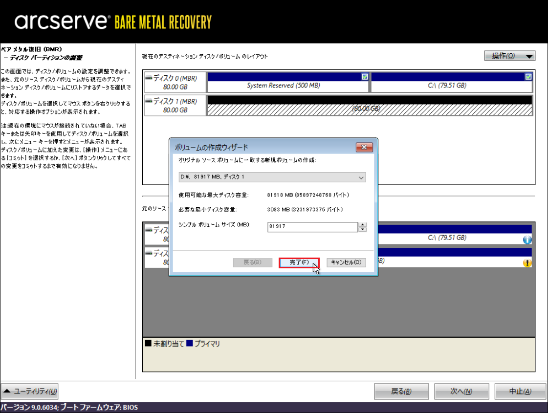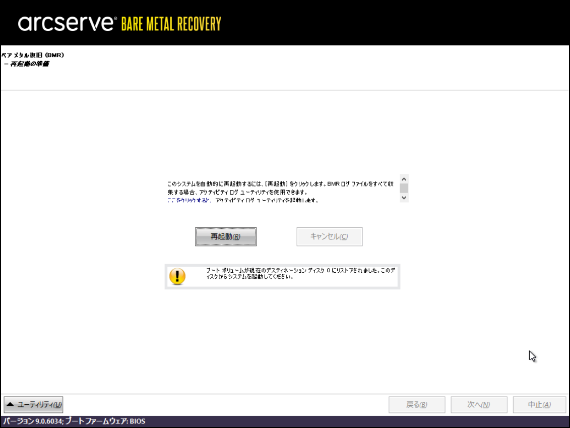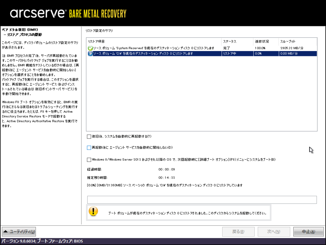 ※ここからArcserveの機能でバックアップファイルから上記の空ボリュームにデータをリストアします。