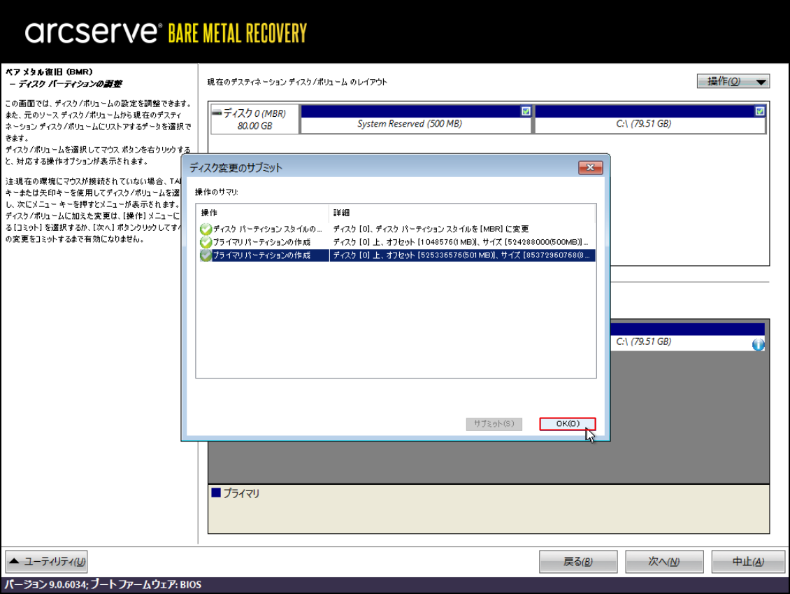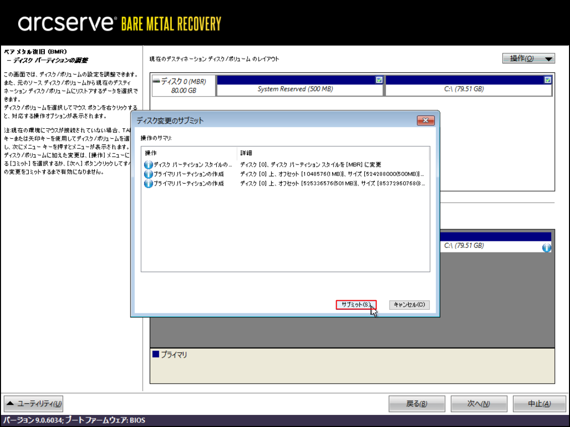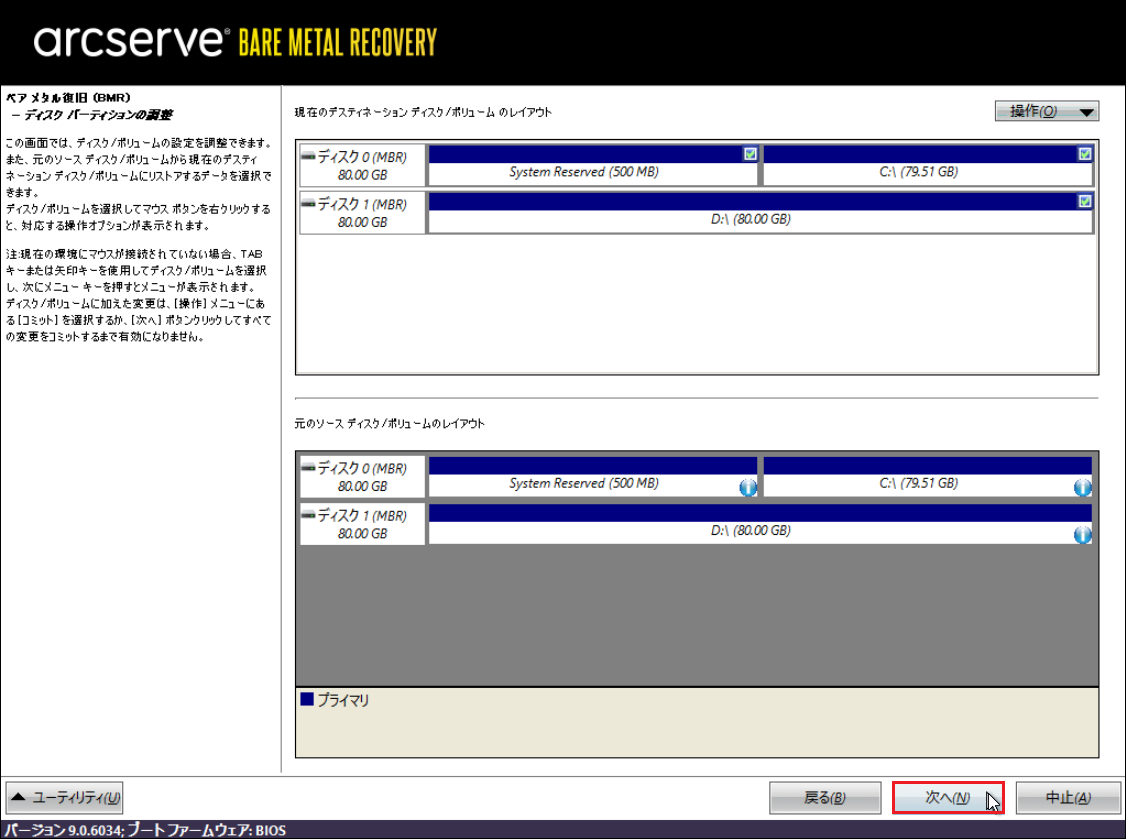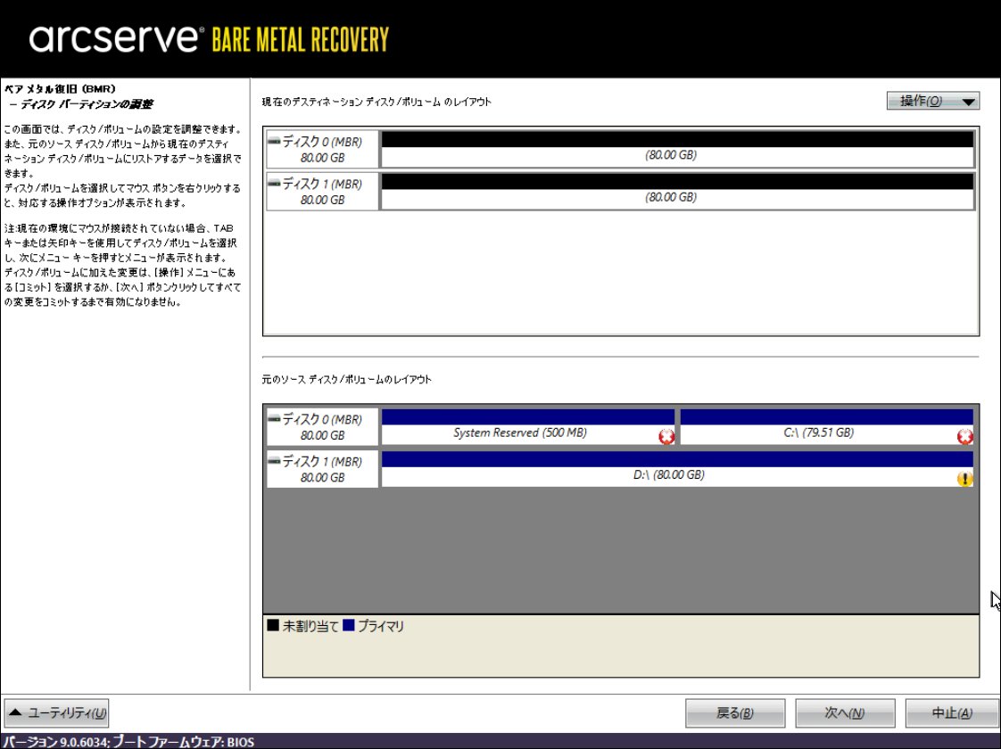 ※ここからArcserveの機能でバックアップファイルから上記の空ボリュームにデータをリストアします。