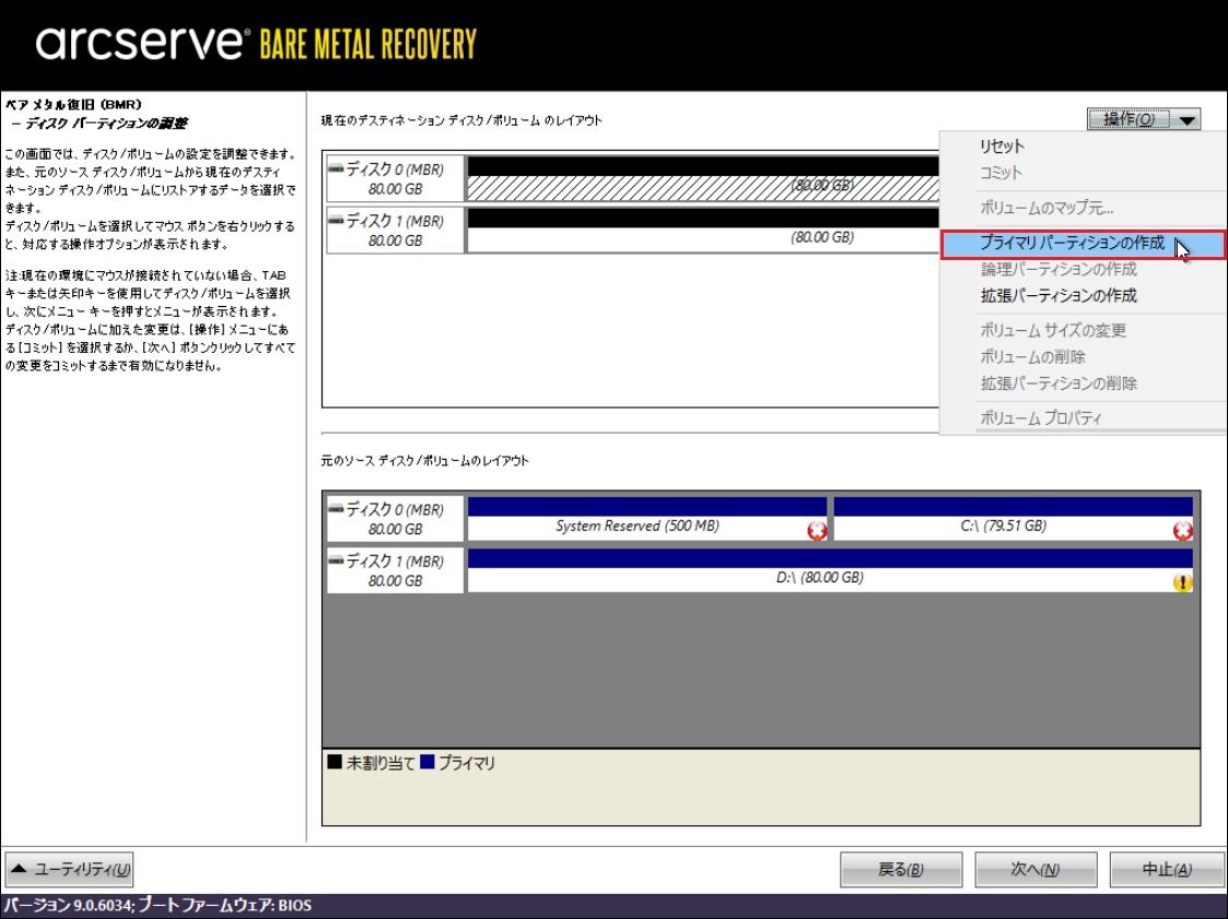 20.その場合は、上段のリストア先ディスク/ボリュームで設定するボリュームを選択した後、[操作]から[プライマリパーティションの作成]を選択して、バックアップデータをすべて設定してください。