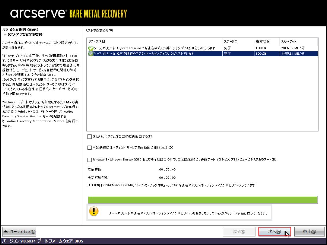 27.リストアが完了すると[次へ]ボタンがアクティブになるので、クリックします。