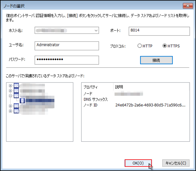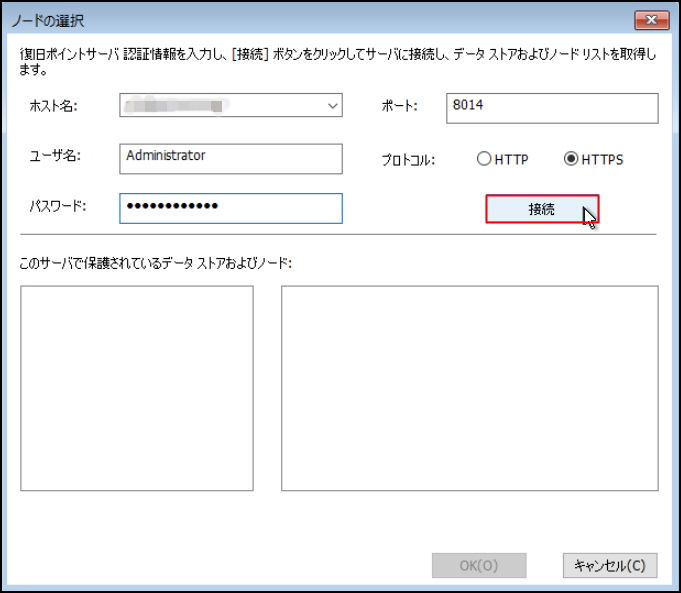 13.復旧ポイントサーバーの「ホスト名」、「ユーザ名」、「パスワード」を入力し、「プロトコル」を[HTTPS]に変更します。その後[接続]をクリックします。