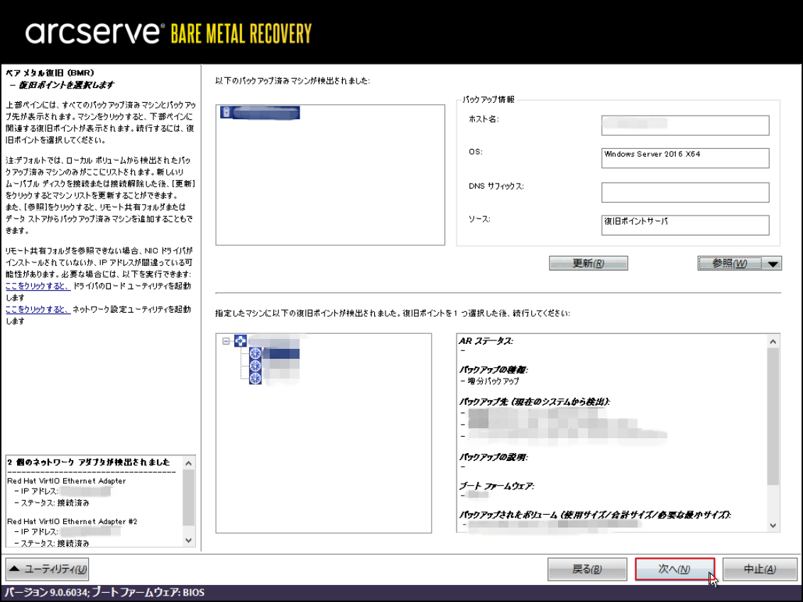 11.下記のような画面にバックアップファイル情報が表示されます。[次へ]をクリックします。