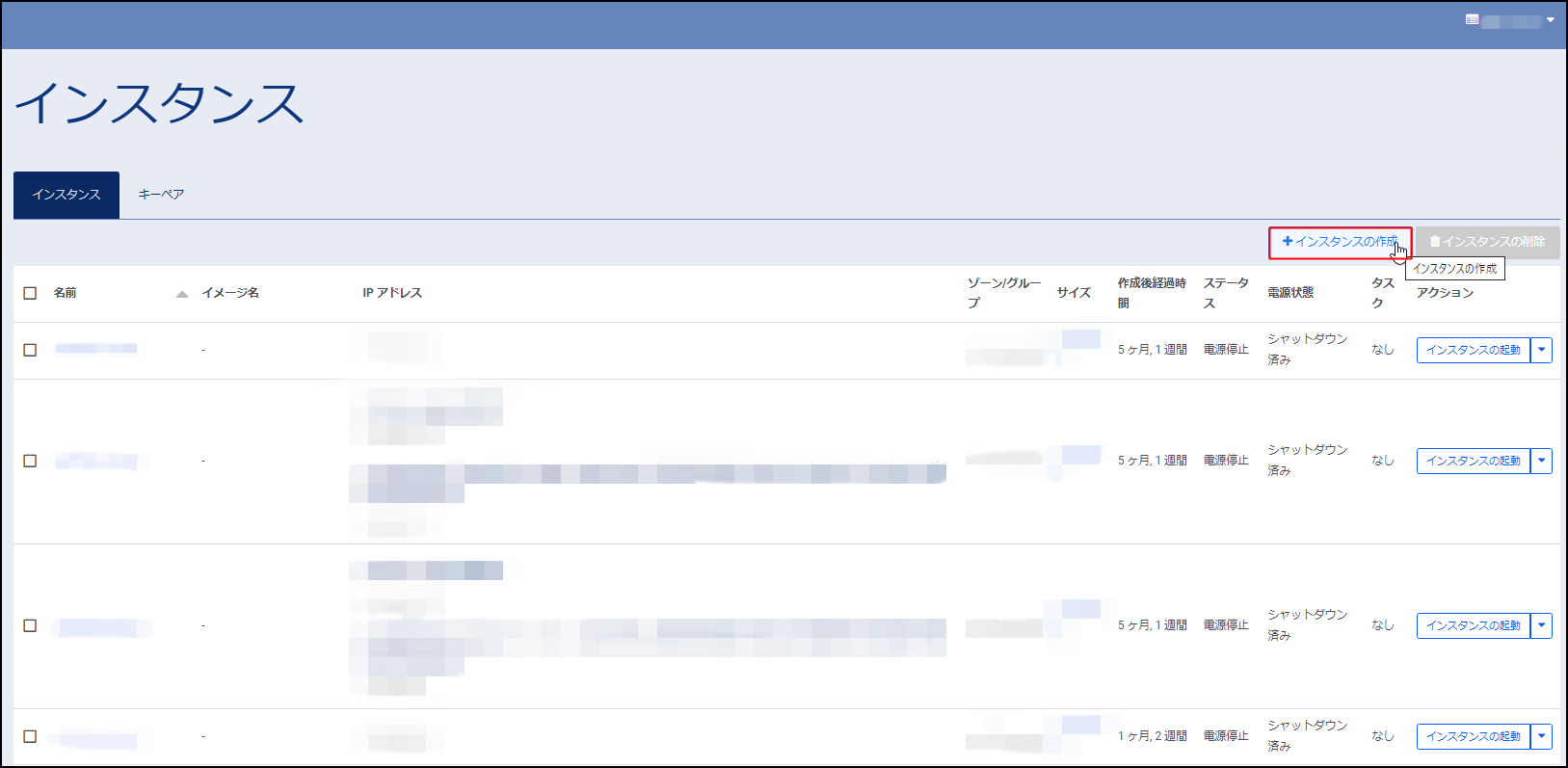 6.次に新規にインスタンス(リストアサーバー)を作成します。[インスタンスの作成]をクリックします。