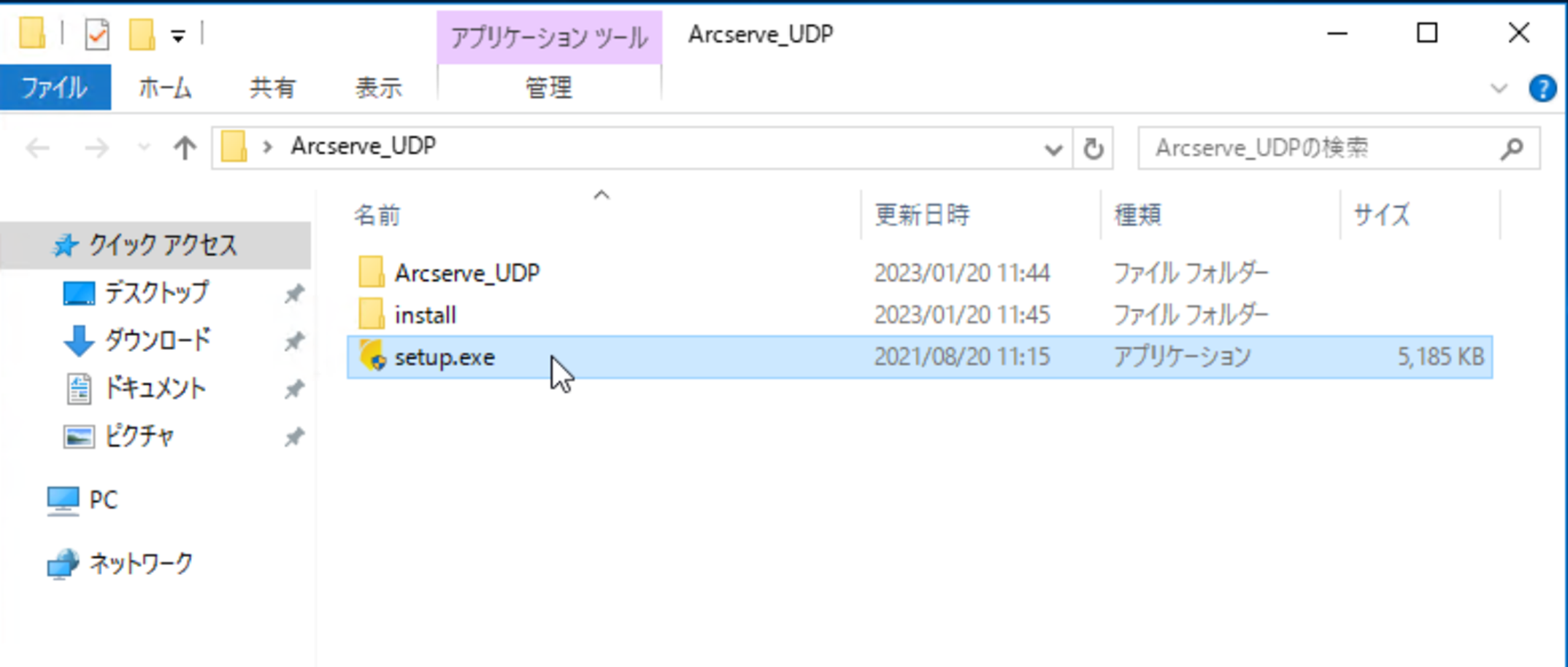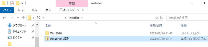 保存した「ArcserveUDP.zip」ファイルを展開し、「ArcserveUDP」フォルダを開きます。