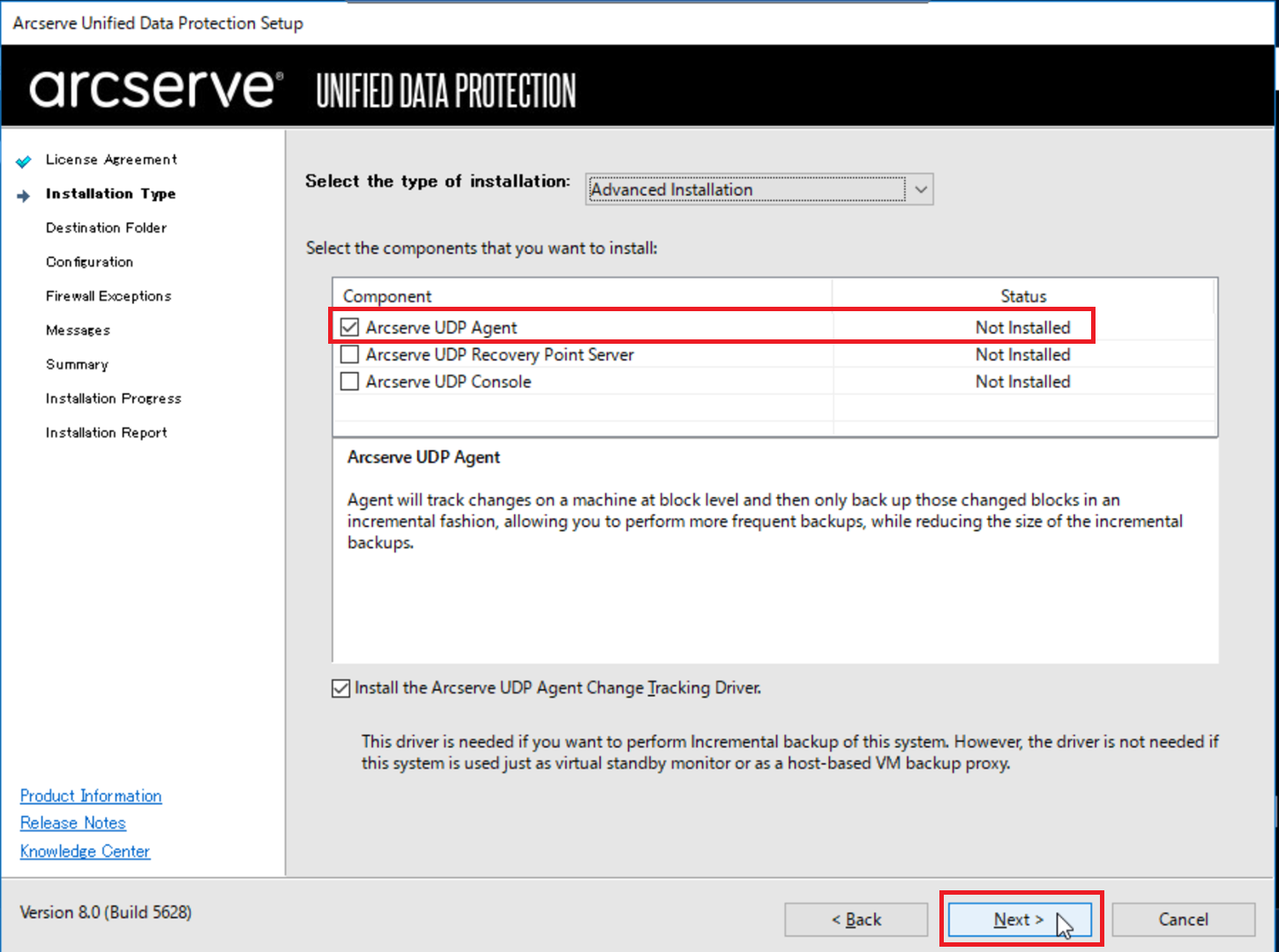 「Arcserve UDP Agent」がチェックされていることを確認し、「Next」をクリックします。