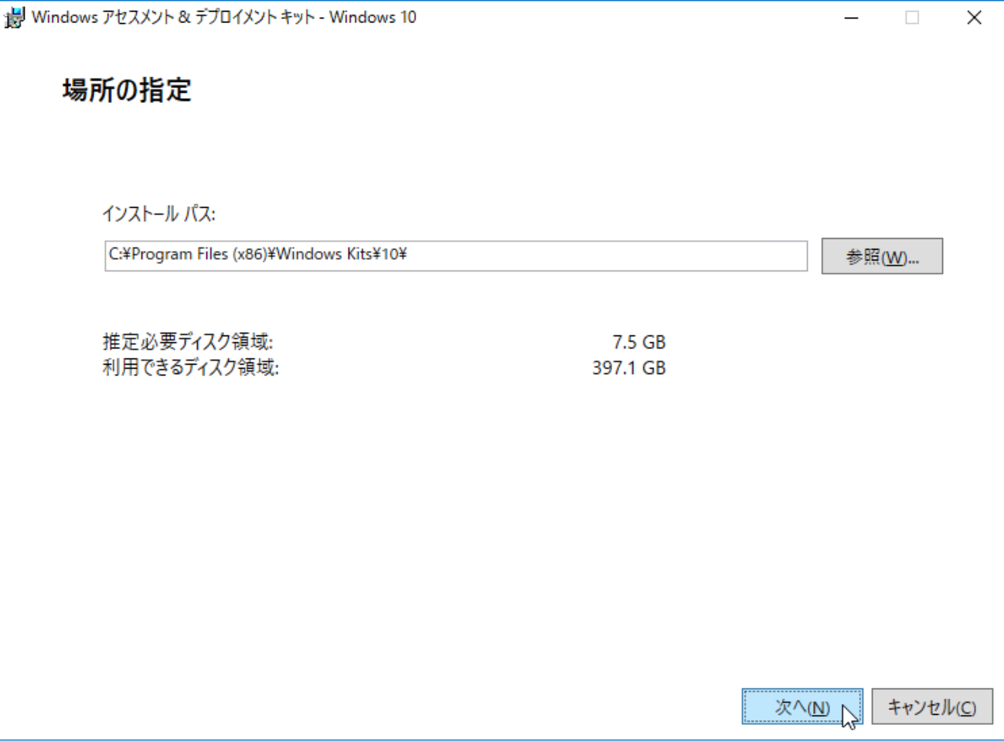 Windows ADKのインストール先フォルダーを指定し、「次へ」をクリックします。