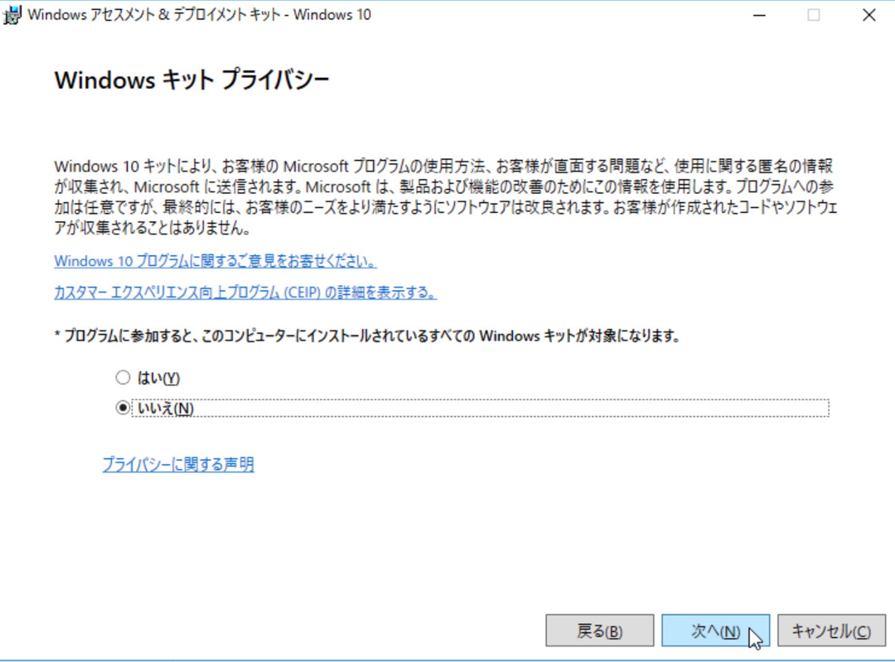 カスタマーエクスペリエンス向上プログラムへの参加にて必要に応じて、「はい」 または 「いいえ」を選択し、「次へ」をクリックします。