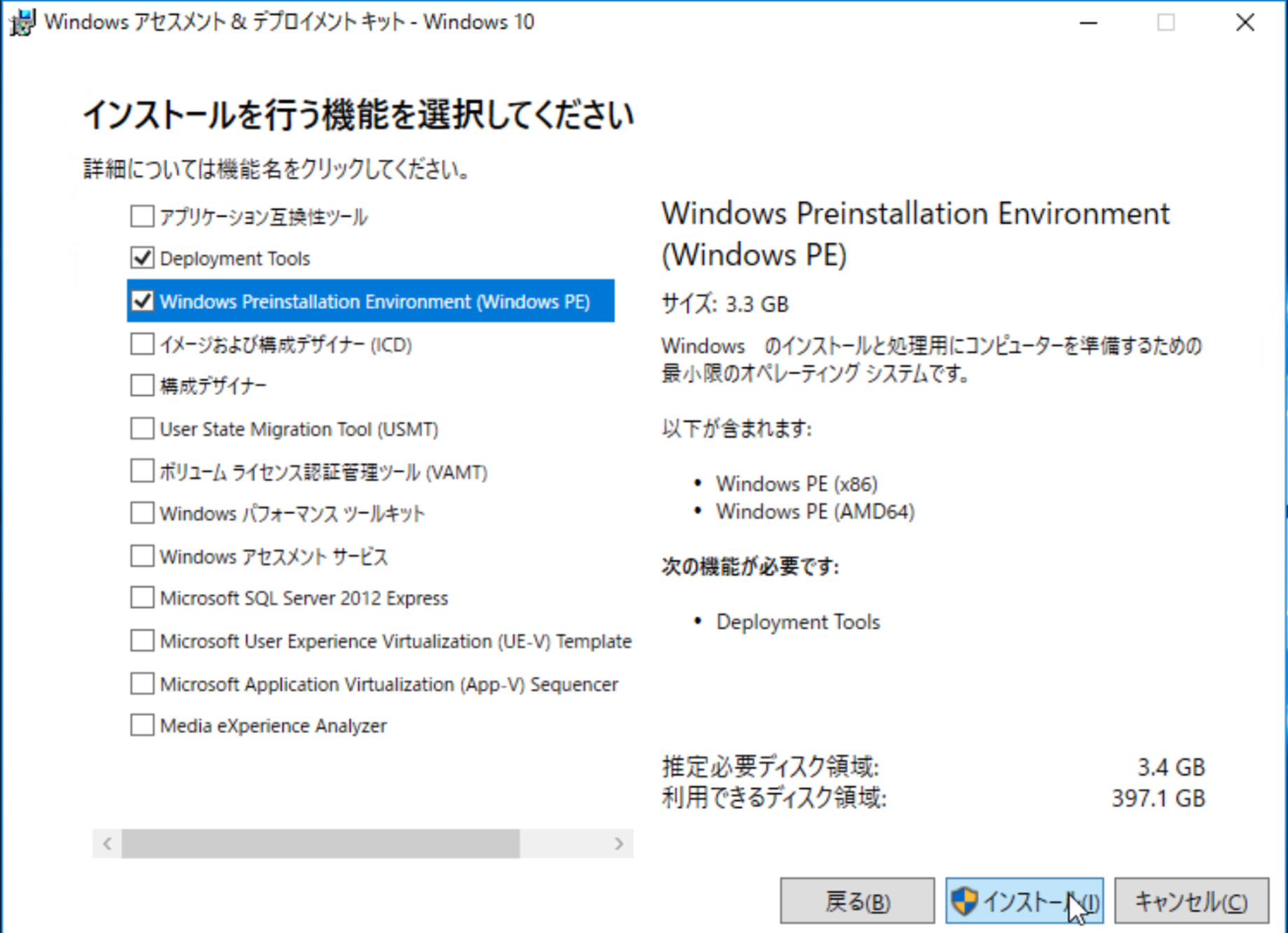 「Deployment Tools」および「Windows Preinstallation Environment (Windows PE)」にチェックを入れ、「インストール」をクリックします。