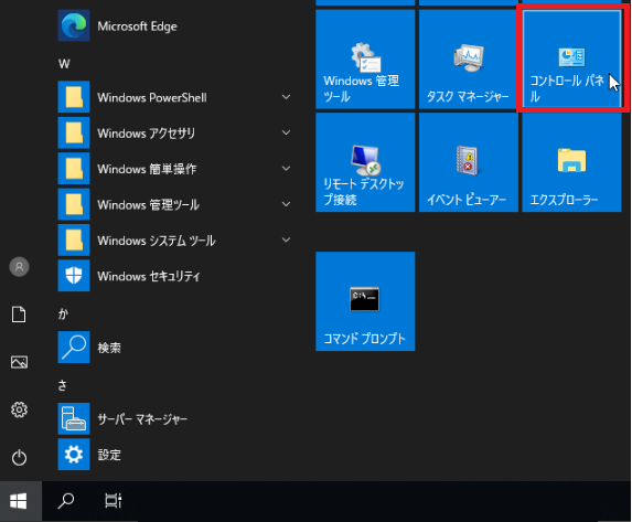 リストア先ベアメタルサーバーにログインし、Windowsのスタートメニューより「コントロールパネル」を開きます。