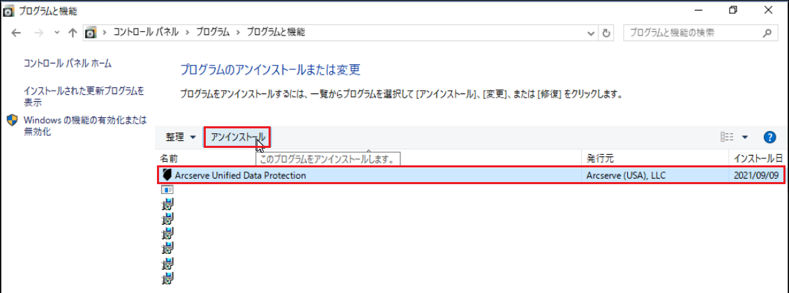 プログラムの一覧から「Arcserve Unified Data Protection」を選択し、「アンインストール」をクリックします。