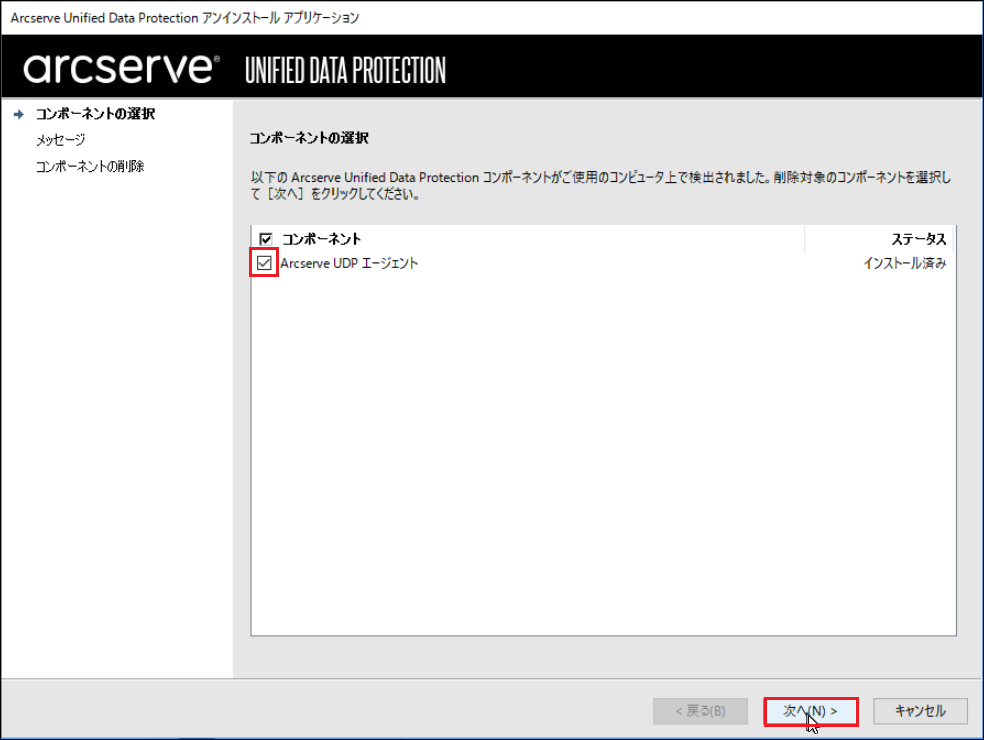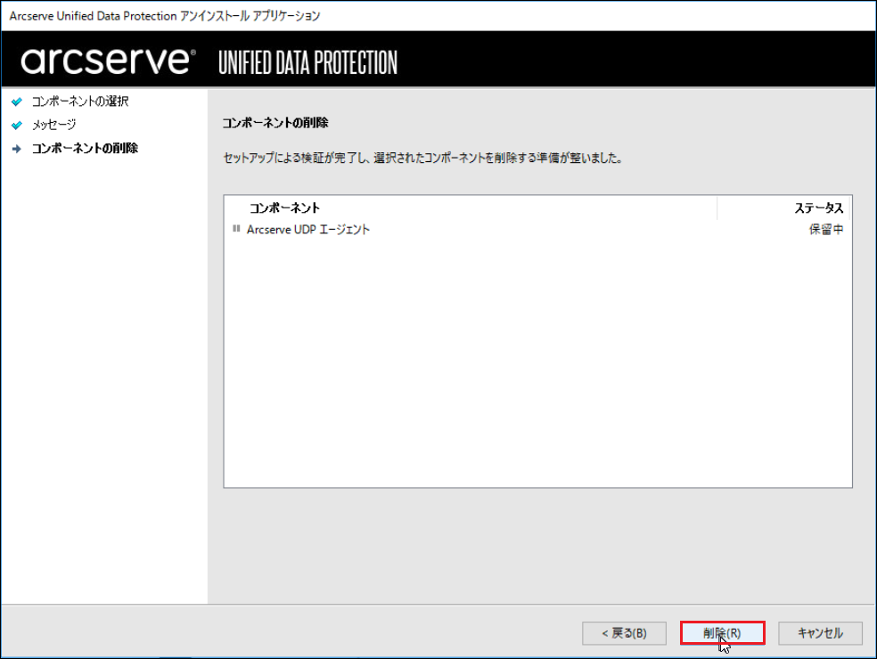 コンポーネントの削除に「ArcserveUDPエージェント」と表示されていることを確認し「削除」をクリックします。