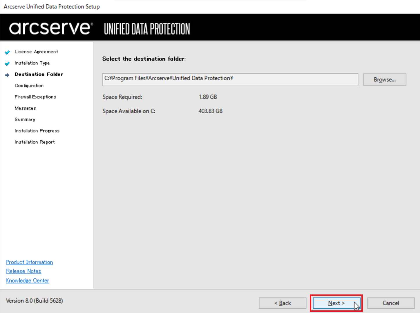 インストール先が、デフォルト(C:Program filesArcserveUnified Data Protection)のまま、「Next」をクリックします。