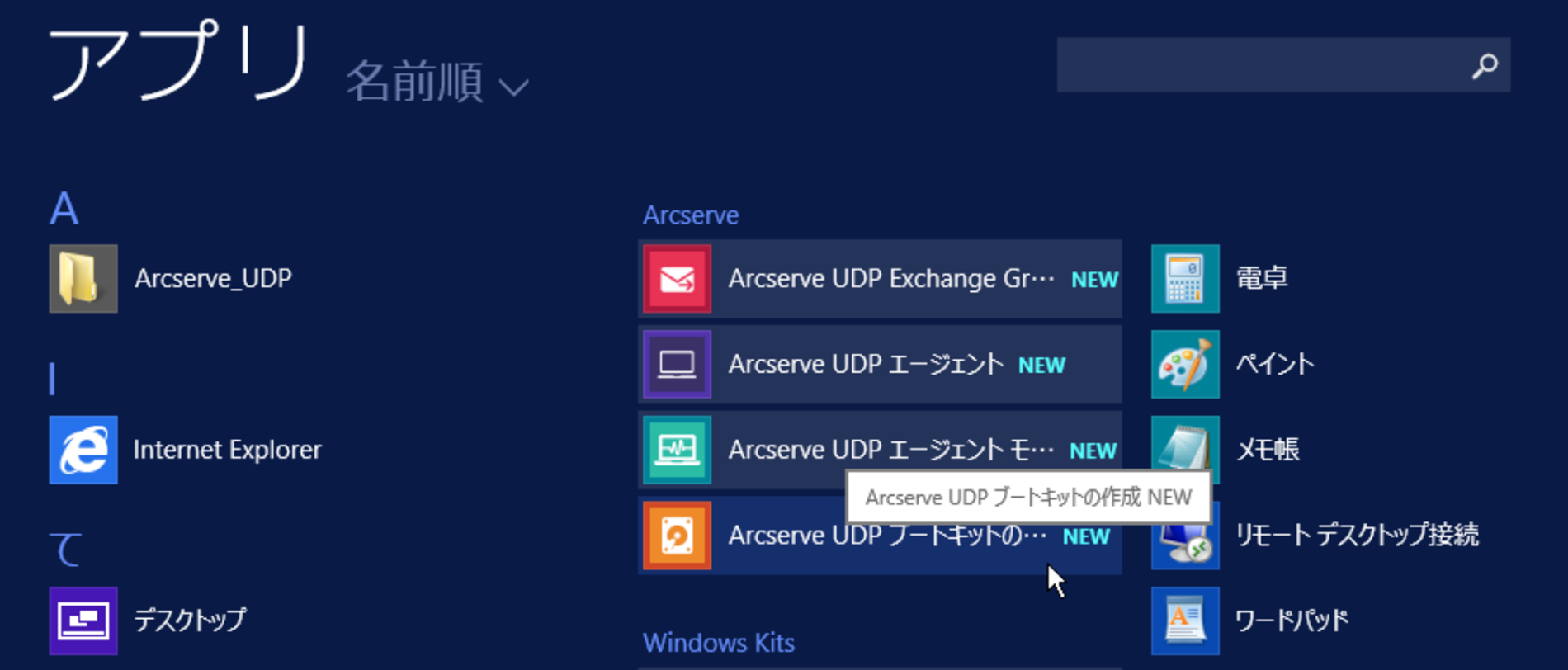 リストア先ベアメタルサーバーにログインし、Windows スタートメニューより「Arcserve UDP ブートキットの作成」をクリックします。