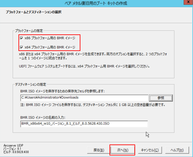 「x86 プラットフォーム用のBMRイメージ」および 「x64 プラットフォーム用のBMRイメージ」の両方にチェックを入れ、「次へ」をクリックします。