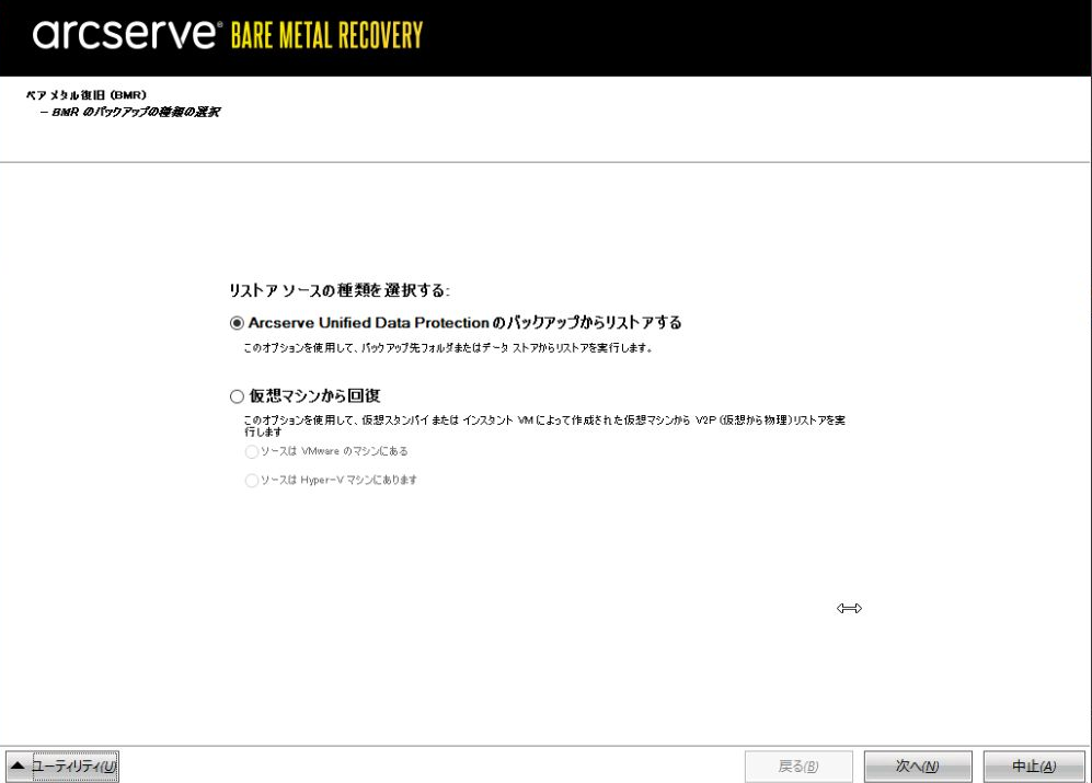 「Arcserve Unified Data Protectionのバックアップからリストアする」を選択し、「次へ」をクリックします。