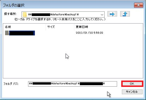 共有フォルダ内のリストアするサーバー名のフォルダーを選択し、「OK」をクリックします。