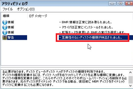 ※アクティビティログに「警告:互換性のないディスクの種類が検出されました。」が表示される場合は以下の手順を実施します。