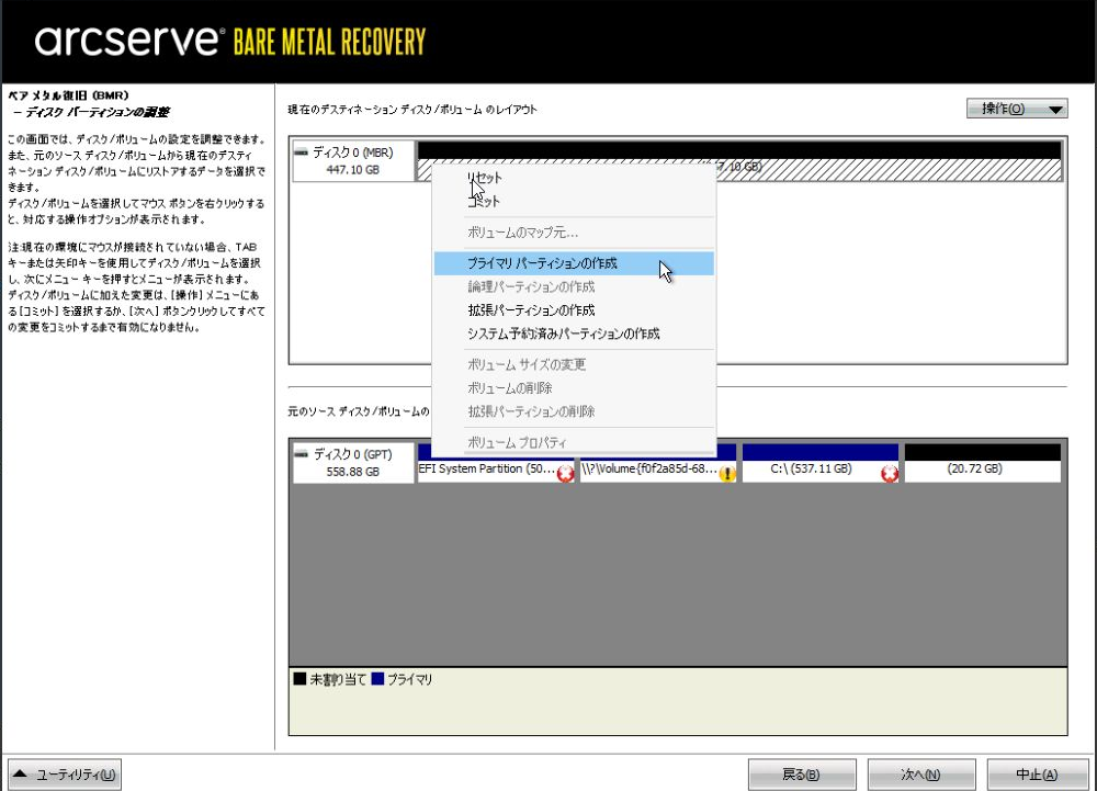 上段のリストア先のディスク容量部分を右クリックし「プライマリパーティションの作成」を選択します。