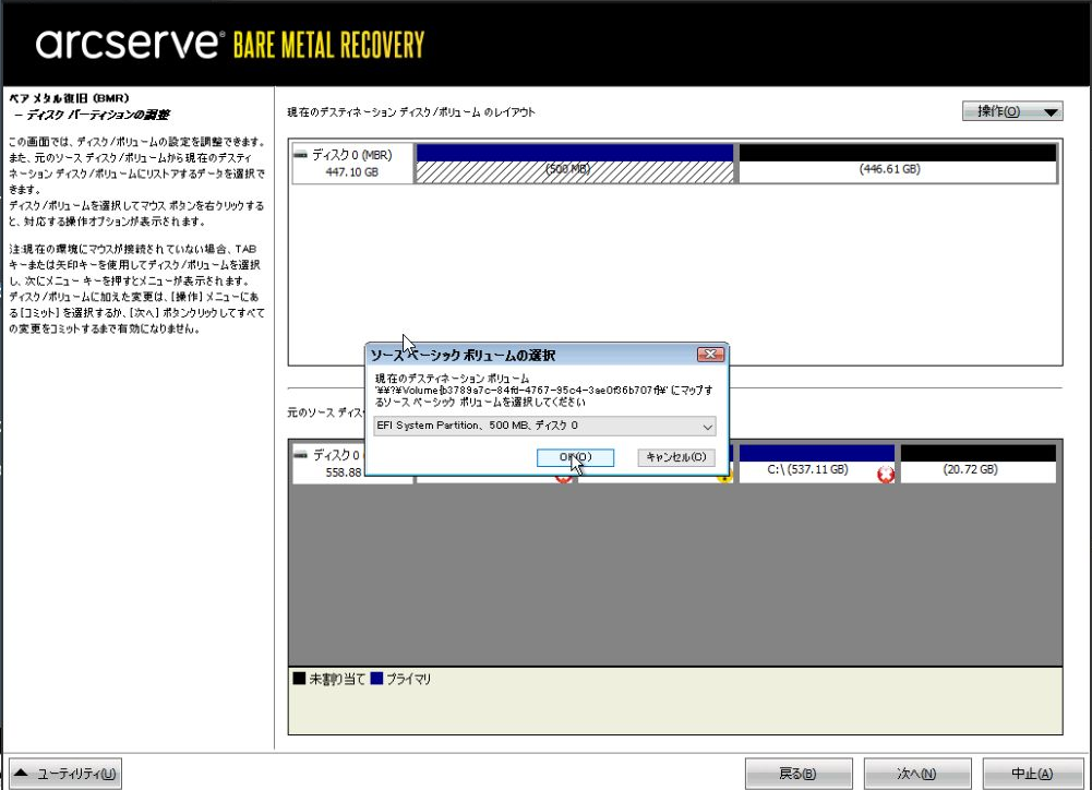 「ソースベーシックボリュームの選択」にて、下段のバックアップデータのディスクと同等のソースベーシックボリュームを選択し、「OK」を選択します。